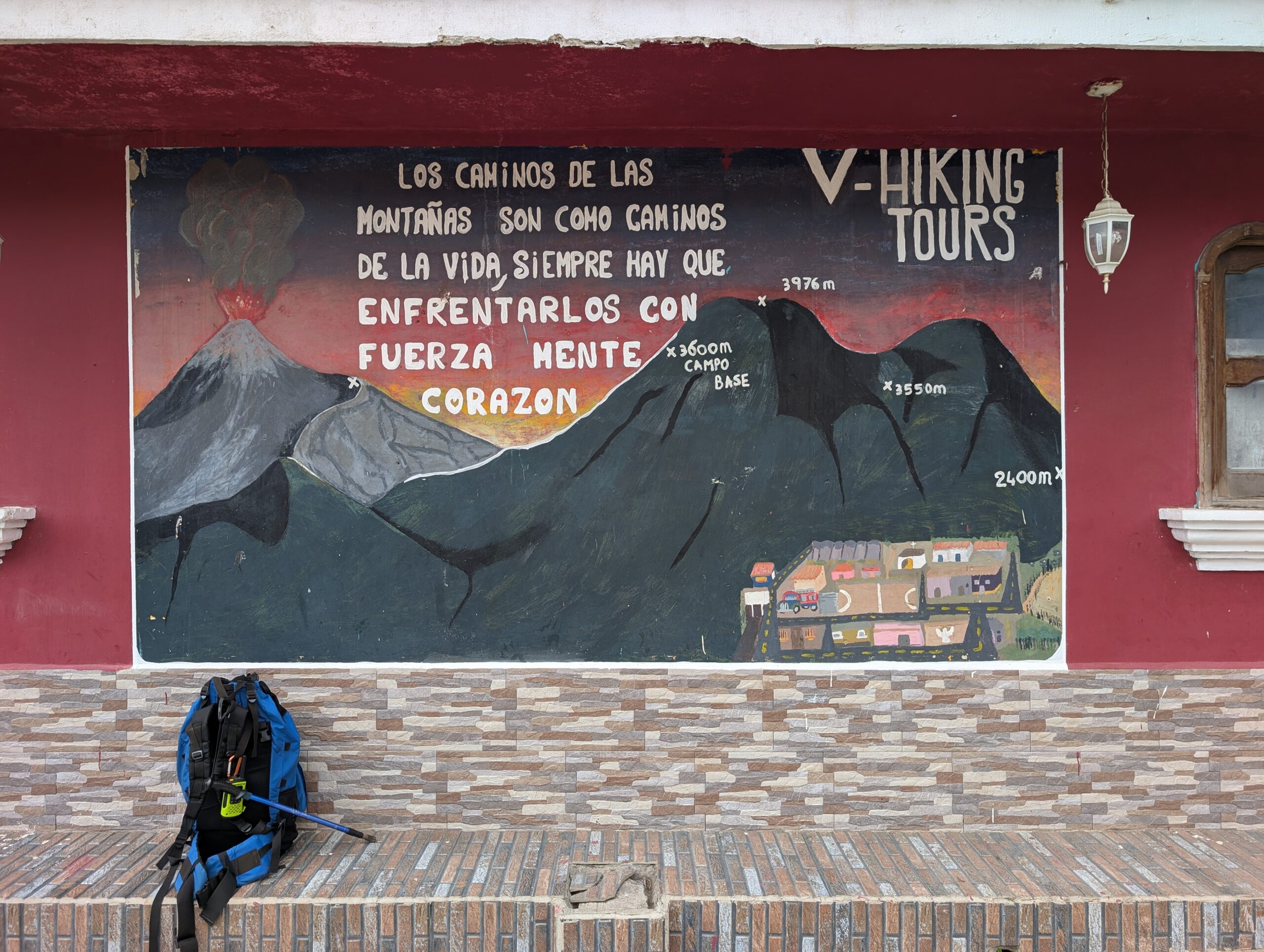 Dimanche, 17 h – La grande majorité des grimpeurs sont planqués dans leur cabanon. Quelques braves guettent la moindre éclaircie, qui permet d’entrapercevoir durant quelques secondes le Fuego tout proche. Alternance de pluie et de brouillard. Visibilité : parcellaire. Éruptions : néant. Température ressentie : -20°C.