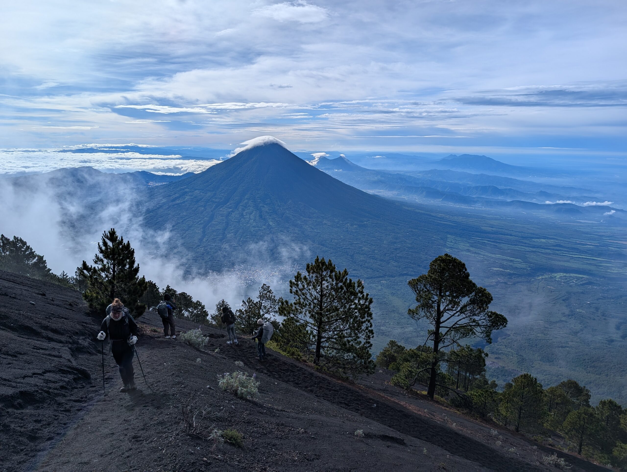 Lundi, 11 h – La descente est longue et éprouvante, mais le petit groupe a le sourire après l’incroyable spectacle que leur a offert le sommet. Bien sûr les éruptions manquent à l’appel, d’autant plus que la plupart des visiteurs ne sont là que pour ça. Mais la philosophie prends le dessus. On reviendra, la vie est longue, tout ça… Petit déjeuner presque au bout du sentier, pour grappiller quelques ultimes forces. Les nuages sont à nouveau copieusement présents. Visibilité : néant. Éruptions : néant. Température ressentie : c’est bon, on a fait sauter progressivement les différentes couches dans la descente.