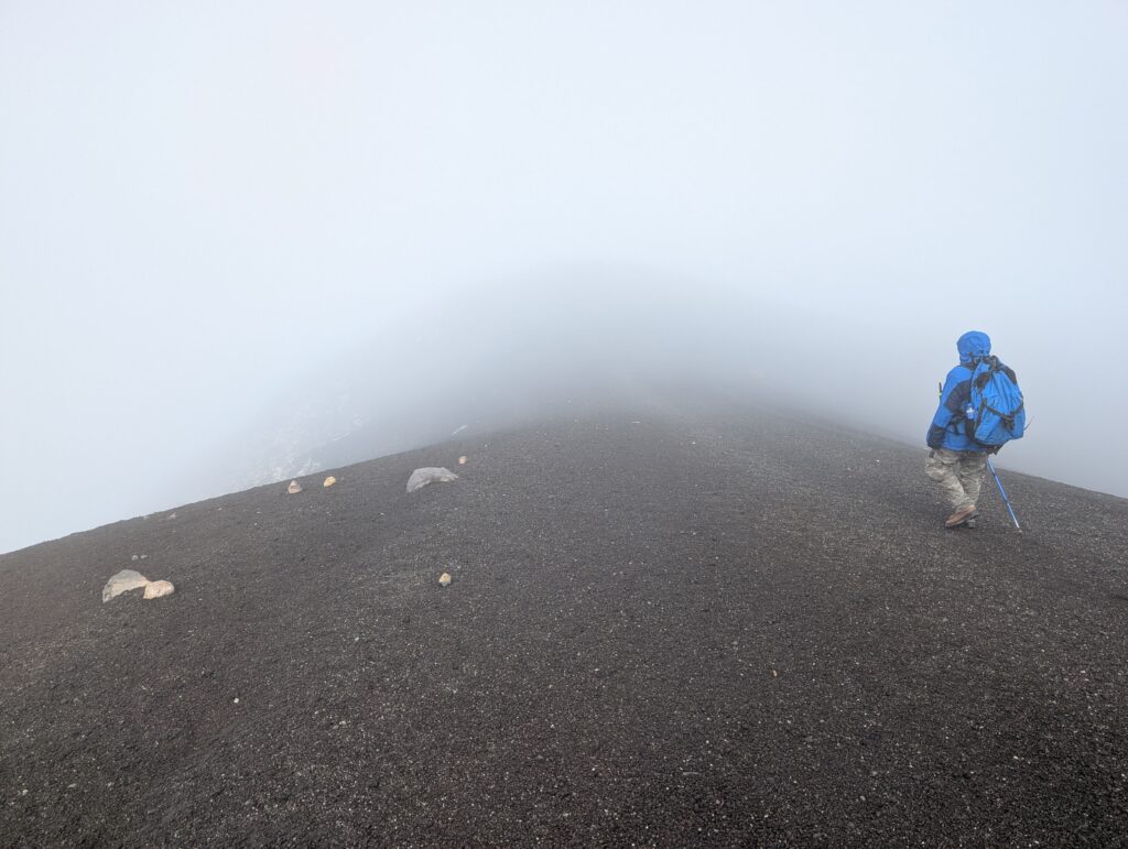 Lundi, 6 h – Un petit café pour tenter de réchauffer les mains engourdies. La pluie s’est arrêtée, mais on ne voit pas à trois mètres. Les guides, conscients que le moral de leur groupe n’est présentement pas au beau fixe, proposent néanmoins de grimper au sommet, qui sera tout autant dans les nuages, mais bon, c’est le sommet quoi. Une majorité de courageux se lancent, après tout on est là pour ça. Visibilité : néant. Éruptions : néant. Température ressentie : -30°C.